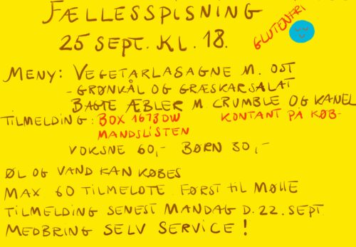 Flere madhold har valgt at sætte et maksimum på antal spisende, hvilket ifølge tovholder på borgerforeningens fællesspisninger Michelle Arena er helt efter bogen. Denne gang kan de første 60 sikre sig en plads torsdag 25. september kl. 18, fremgår det af Anne Aggers opslag. Menuen er glutenfri og består af vegetarlasagne med ost, grønkål og græskarsalat samt bagte æbler med crumble og kanel. Nytilflyttere spiser gratis første gang mod en kort præsentation, og alle må huske eget bestik og service. Se opslaget om priser og tilmelding.
