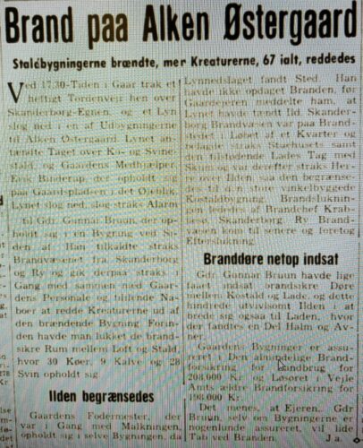 Havde det ikke været for ny brandsikring kunne det åbenbart være gået meget værre. Hen under aften søndag 5. juni 1955, da køerne var kommet ind fra marken og aftenmalkningen var begyndt, trak det op til tordenvejr, og lynet slog ned i taget på en staldlænge på Alken Østergaard. Ifølge Silkeborg Avis slog medhjælper Erik Binderup alarm til gårdejer Gunnar Bruun, som tilkaldte brandvæsen fra både Ry og Skanderborg. Ansatte og naboer hjalp med at redde kreaturer ud af stalden, så alle 67 dyr overlevede: 30 køer, ni kalve og 28 svin.