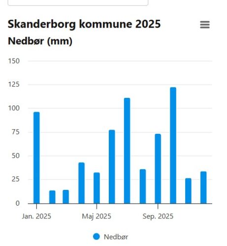 Hvis du kan rumme flere tal: Måneden siden 2011 med allerlavest nedbør var marts 2022 (bare 2,9 mm i en hel måned), mens måneden med allerhøjest nedbør var oktober 2023 (hele 219,4), der blev vådeste oktober i 25 år og var med til at gøre det år så vådt.