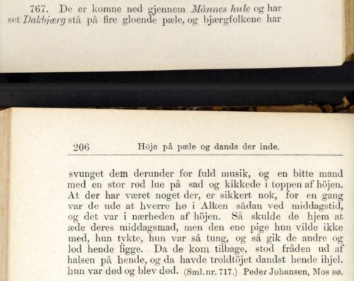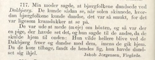 At bjergfolk og troldtøj har danset ved Dakbjerg nær Boes Skov er uomtvisteligt. Det har været smukt at se, ligefrem bjergtagende – og det kunne ende galt, når almindelige dødelige blandede sig i dansen. Det vidner flere gamle folkeminder om, for dansen er foregået i andre høje over hele landet – så mange, at et helt kapitel i Evald Tang Kristensens samling har fået titlen “Höje på pæle – og dands der inde”. Når det gælder Dakbjerg, er der i første omgang historien fra Jakob Jörgensen, Firgårde. En kramdukke er en legetøjsdukke. Onden er et måltid midt på dagen.