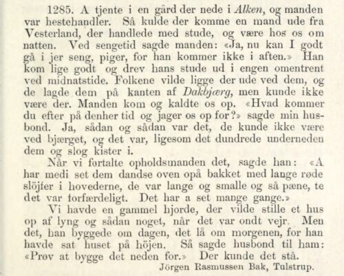 Historierne er indsamlet af folkemindesamler Evald Tang Kristensen (1843-1929), som gik rundt fra hus til hus og og hørte folks fortællinger og fik fra 1892-1901 udgivet samlingen “Danske sagn, som de har lydt i folkemunde“. Illustrationen er linoleumstryk fra et skoleprojekt i 2007 på Rudolf Steiner-skolen i Aarhus, hvor nu afdøde Bjarne Toudahl fra Alken underviste.